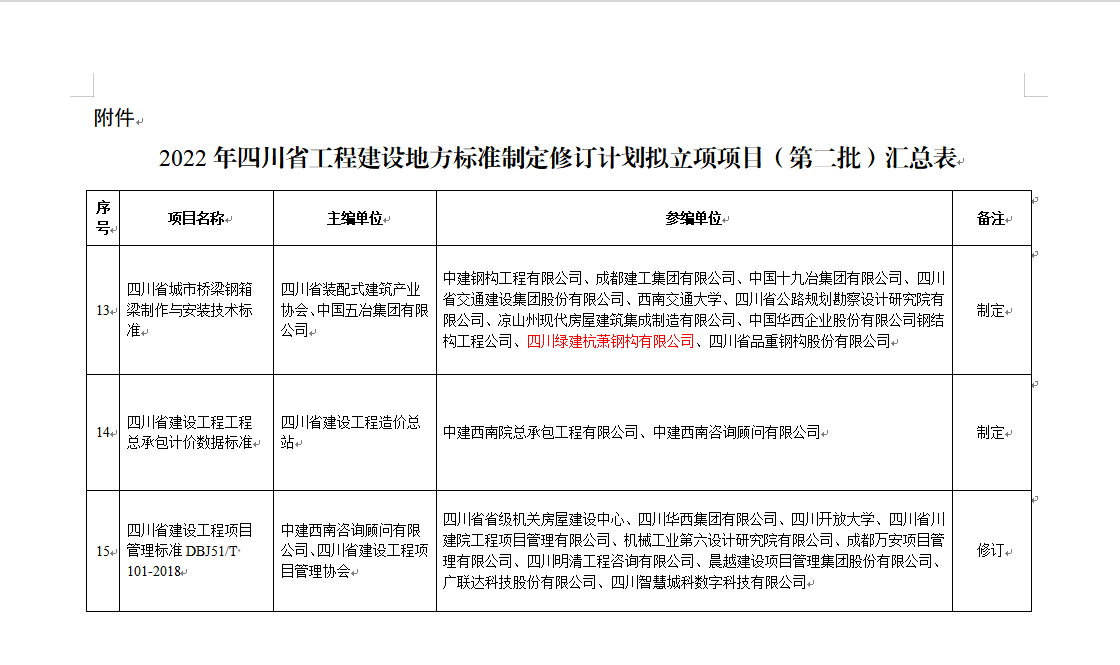 “行業(yè)標(biāo)準(zhǔn)為旗桿,科研技術(shù)為導(dǎo)向”,2022年8月22日,四川綠建杭蕭鋼構(gòu)有限公司(以下簡稱:綠建杭蕭)參編的《四川省城市橋梁鋼箱梁制作與安裝技術(shù)標(biāo)準(zhǔn)》在四川省住建廳官網(wǎng)進(jìn)行公示。這是繼“中國鋼結(jié)構(gòu)協(xié)會(huì)”會(huì)員單位、第二批天府綜改企業(yè)之后,同年再次獲得的殊榮。綠建杭蕭在行業(yè)領(lǐng)域標(biāo)準(zhǔn)中發(fā)出了自己的聲音!